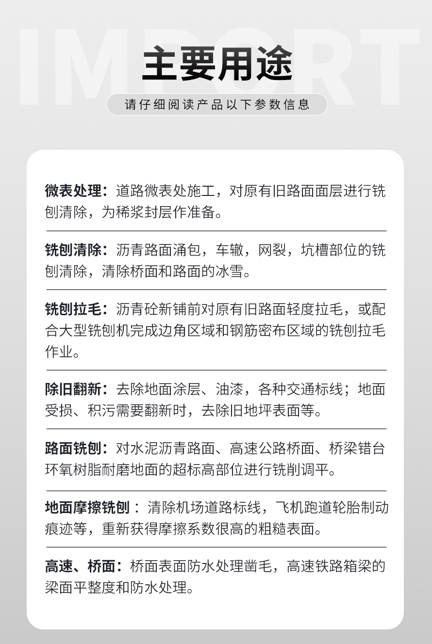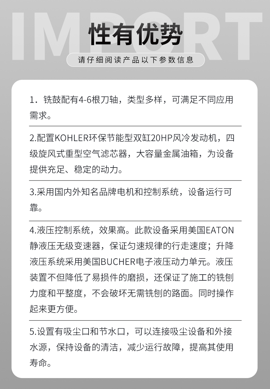 液壓銑刨機結(jié)構(gòu)緊湊,布局合理,具有控制精度高、性能穩(wěn)定、操作簡單、維護(hù)保養(yǎng)方便等優(yōu)勢。其適合各種強度較高的混凝土瀝青等高出部分的去除工作,是其它類型的銑刨機無法替代的產(chǎn)品。