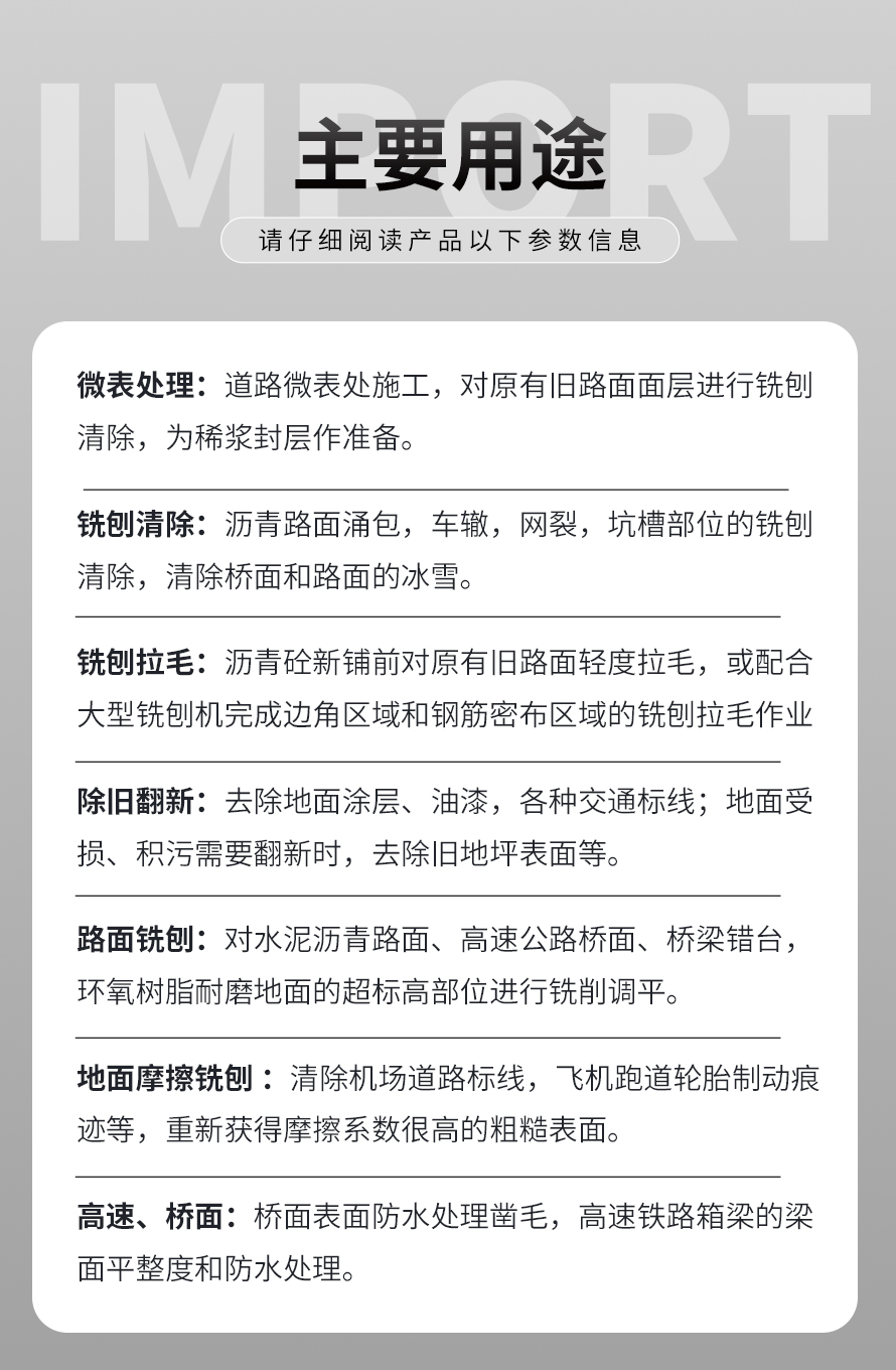 用于橋面鋪設(shè)瀝青或車間舊的混凝土地面重新攤鋪混凝土之前,清除水泥浮漿以及鏟平拉毛, 也用于清除建筑施工中的堅硬灰渣。