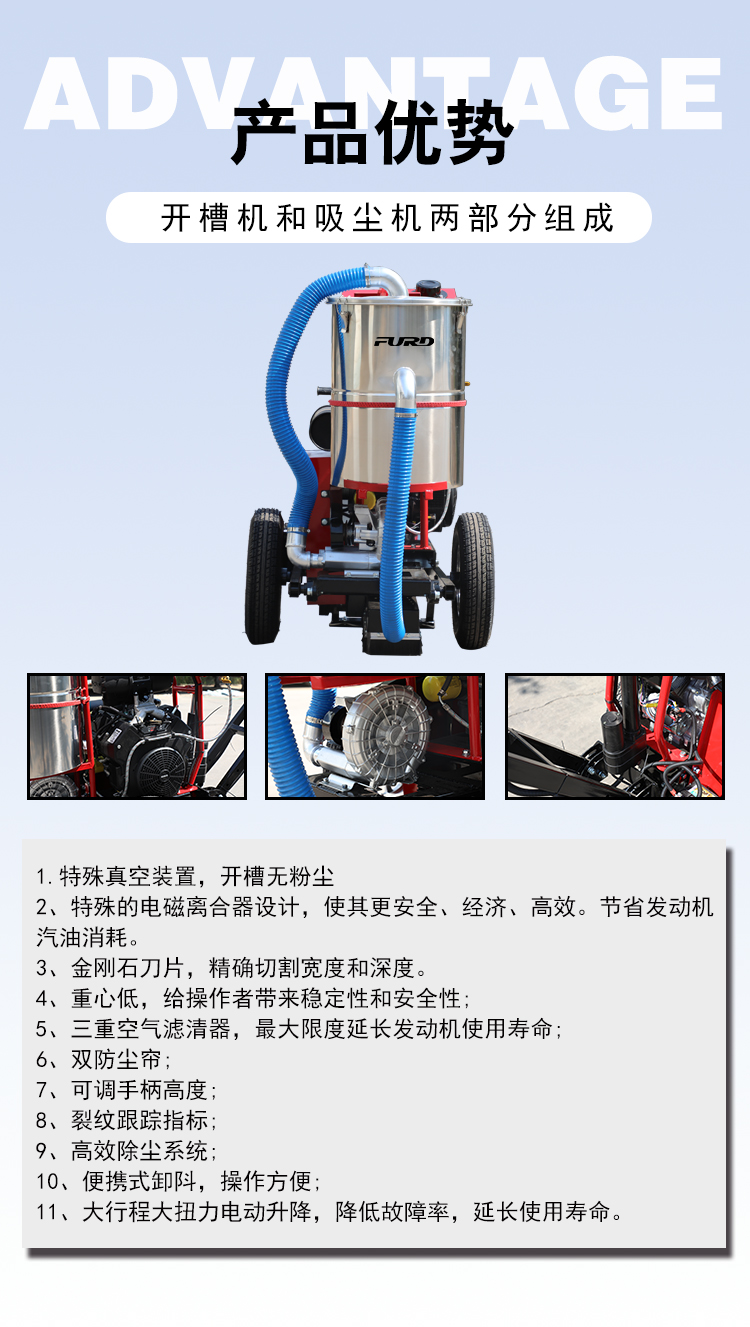 自吸塵式路面開槽機(jī)主要用于瀝青路面修補(bǔ)裂縫開槽的機(jī)械,其集吸塵、開槽為一體,環(huán)保性好,工作效果高,是路面開槽施工不錯的選擇。
