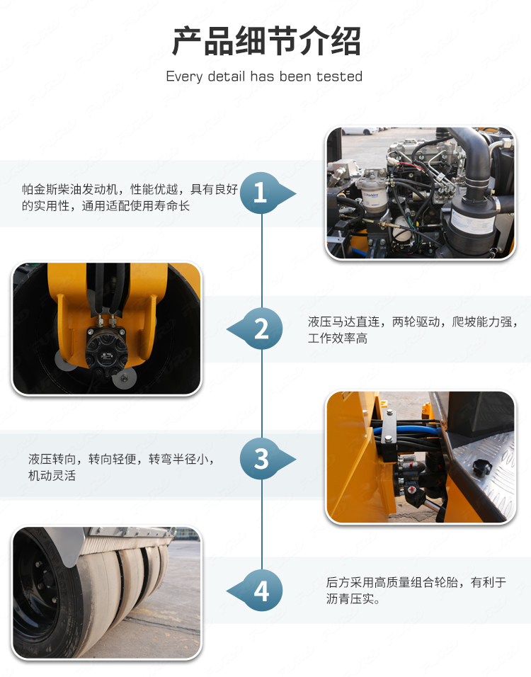 FYL-900T為橡膠輪胎振動壓路機,該壓路機前有鋼輪,后有橡膠輪,結合鋼輪和輪胎壓路機的優(yōu)點,具有更高的工作效率。
